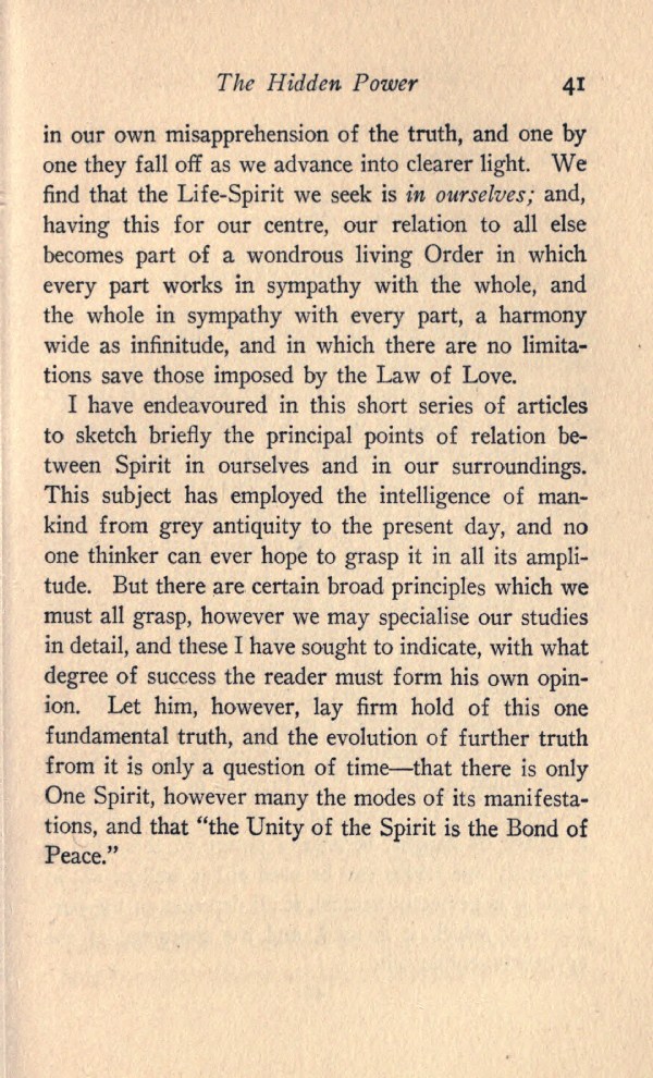 I have endeavoured in this short series of articles to sketch briefly the principal points of relation between Spirit in ourselves and in our surroundings. This subject has employed the intelligence of mankind from grey antiquity to the present day, and no one thinker can ever hope to grasp it in all its amplitude. But there are certain broad principles which we must all grasp, however we may specialise our studies in detail, and these I have sought to indicate, with what degree of success the reader must form his own opinion. Let him, however, lay firm hold of this one fundamental truth, and the evolution of further truth from it is only a question of time--that there is only One Spirit, however many the modes of its manifestations, and that "the Unity of the Spirit is the Bond of Peace."