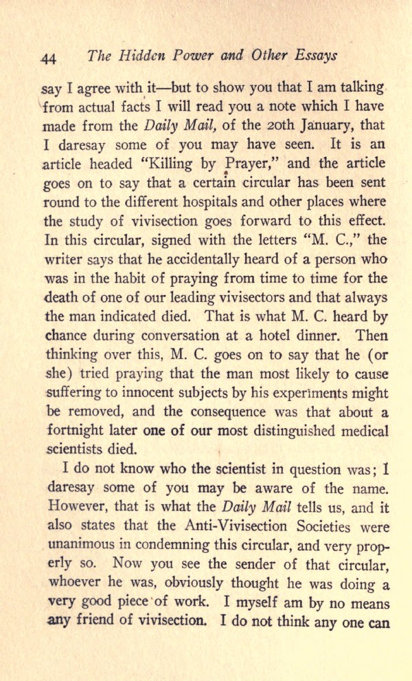 say I agree with it--but to show you that I am talking from actual facts I will read you a note which I have made from the Daily Mail, of the 10th January, that I daresay some of you may have seen. It is an article headed "Killing by Prayer," and the article goes on to say that a certain circular has been sent round to the different hospitals and other places where the study of vivisection goes forward to this effect. In this circular, signed with the letters "M. C.," the writer says that he accidentally heard of a person who was in the habit of praying from time to time for the death of one of our leading vivisectors and that always the man indicated died. That is what M. C. heard by chance during conversation at a hotel dinner. Then thinking over this, M. C. goes on to say that he (or she) tried praying that the man most likely to cause suffering to innocent subjects by his experiments might be removed, and the consequence was that about a fortnight later one of our most distinguished medical scientists died.
