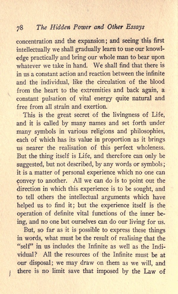 This is the great secret of the livingness of Life, and it is called by many names and set forth under many symbols in various religions and philosophies, each of which has its value in proportion as it brings us nearer the realisation of this perfect wholeness. But the thing itself is Life, and therefore can only be suggested, but not described, by any words or symbols; it is a matter of personal experience which no one can convey to another. All we can do is to point out the direction in which this experience is to be sought, and to tell others the intellectual arguments which have helped us to find it; but the experience itself is the operation of definite vital functions of the inner being, and no one but ourselves can do our living for us.