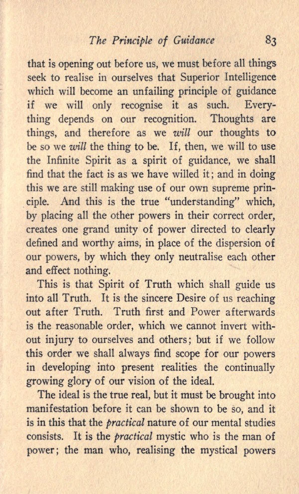 that is opening out before us, we must before all things seek to realise in ourselves that Superior Intelligence which will become an unfailing principle of guidance if we will only recognise it as such. Everything depends on our recognition. Thoughts are things, and therefore as we will our thoughts to be so we will the thing to be. If, then, we will to use the Infinite Spirit as a spirit of guidance, we shall find that the fact is as we have willed it; and in doing this we are still making use of our own supreme principle. And this is the true "understanding" which, by placing all the other powers in their correct order, creates one grand unity of power directed to clearly defined and worthy aims, in place of the dispersion of our powers, by which they only neutralise each other and effect nothing.