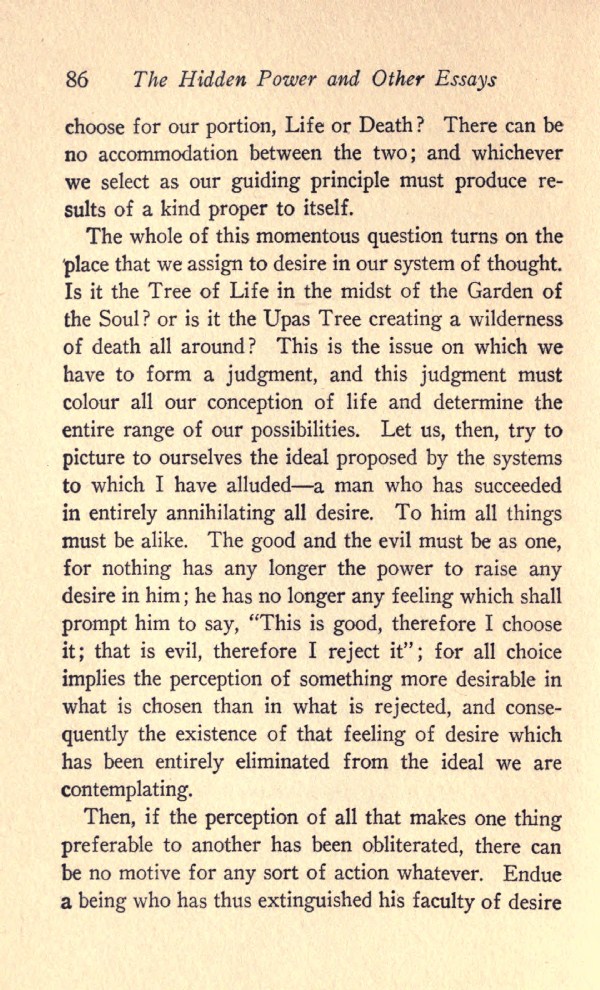 The whole of this momentous question turns on the place that we assign to desire in our system of thought. Is it the Tree of Life in the midst of the Garden of the Soul? or is it the Upas Tree creating a wilderness of death all around? This is the issue on which we have to form a judgment, and this judgment must colour all our conception of life and determine the entire range of our possibilities. Let us, then, try to picture to ourselves the ideal proposed by the systems to which I have alluded--a man who has succeeded in entirely annihilating all desire. To him all things must be alike. The good and the evil must be as one, for nothing has any longer the power to raise any desire in him; he has no longer any feeling which shall prompt him to say, "This is good, therefore I choose it; that is evil, therefore I reject it"; for all choice implies the perception of something more desirable in what is chosen than in what is rejected, and consequently the existence of that feeling of desire which has been entirely eliminated from the ideal we are contemplating.