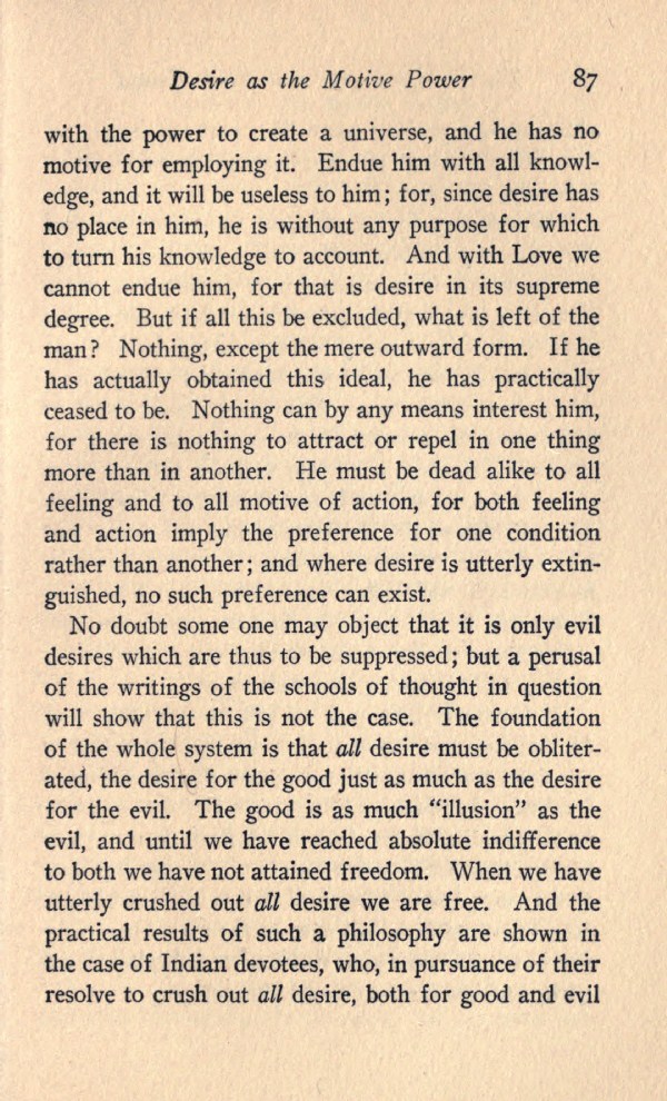 No doubt some one may object that it is only evil desires which are thus to be suppressed; but a perusal of the writings of the schools of thought in question will show that this is not the case. The foundation of the whole system is that all desire must be obliterated, the desire for the good just as much as the desire for the evil. The good is as much "illusion" as the evil, and until we have reached absolute indifference to both we have not attained freedom. When we have utterly crushed out all desire we are free. And the practical results of such a philosophy are shown in the case of Indian devotees, who, in pursuance of their resolve to crush out all desire, both for good and evil