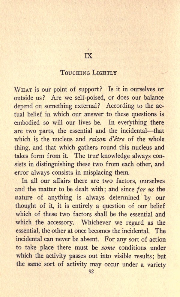WHAT is our point of support? Is it in ourselves or outside us? Are we self-poised, or does our balance depend on something external? According to the actual belief in which our answer to these questions is embodied so will our lives be. In everything there are two parts, the essential and the incidental--that which is the nucleus and raison d'etre of the whole thing, and that which gathers round this nucleus and takes form from it. The true knowledge always consists in distinguishing these two from each other, and error always consists in misplacing them.