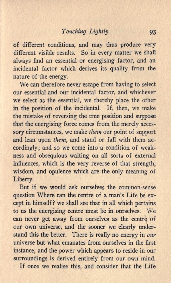 But if we would ask ourselves the common-sense question Where can the centre of a man's Life be except in himself? we shall see that in all which pertains to us the energising centre must be in ourselves. We can never get away from ourselves as the centre of our own universe, and the sooner we clearly understand this the better. There is really no energy in our universe but what emanates from ourselves in the first instance, and the power which appears to reside in our surroundings is derived entirely from our own mind.