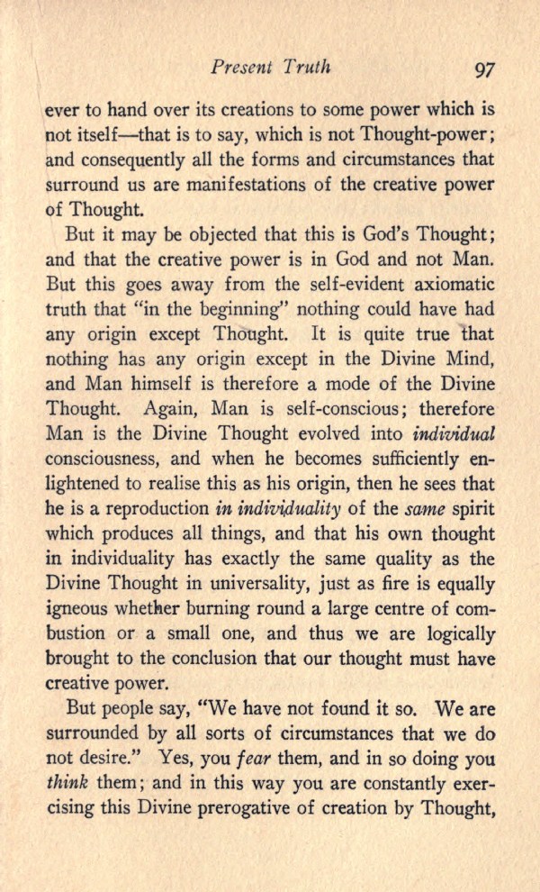 But it may be objected that this is God's Thought; and that the creative power is in God and not Man. But this goes away from the self-evident axiomatic truth that "in the beginning" nothing could have had any origin except Thought. It is quite true that nothing has any origin except in the Divine Mind, and Man himself is therefore a mode of the Divine Thought. Again, Man is self-conscious; therefore Man is the Divine Thought evolved into individual consciousness, and when he becomes sufficiently enlightened to realise this as his origin, then he sees that he is a reproduction in individuality of the same spirit which produces all things, and that his own thought in individuality has exactly the same quality as the Divine Thought in universality, just as fire is equally igneous whether burning round a large centre of combustion or a small one, and thus we are logically brought to the conclusion that our thought must have creative power.