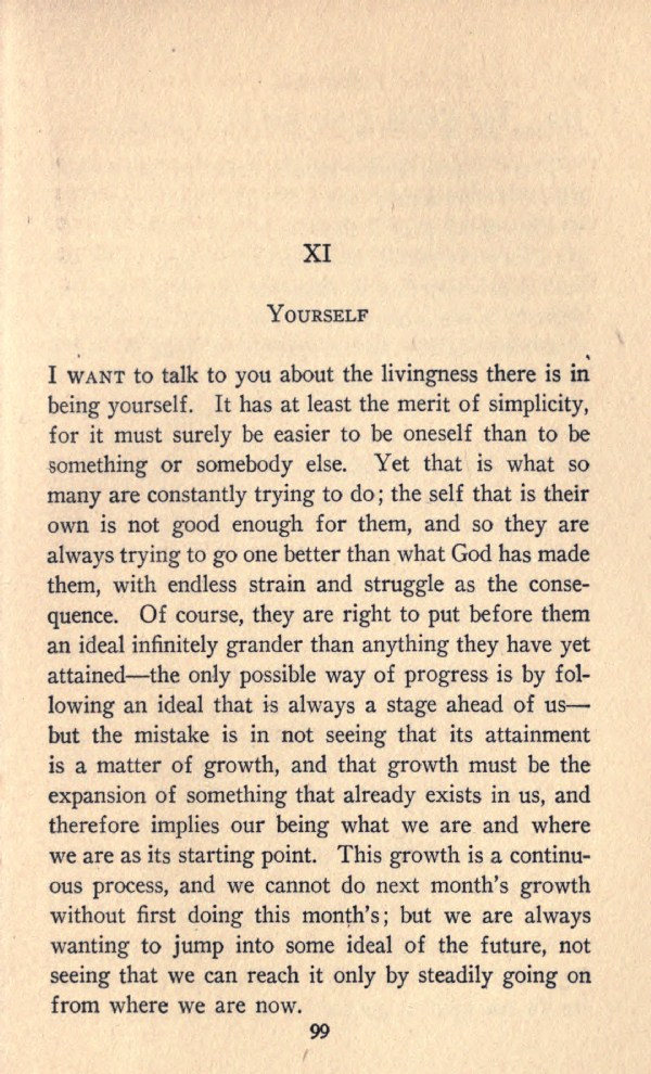 I want to talk to you about the livingness there is in being yourself. It has at least the merit of simplicity, for it must surely be easier to be oneself than to be something or somebody else. Yet that is what so many are constantly trying to do; the self that is their own is not good enough for them, and so they are always trying to go one better than what God has made them, with endless strain and struggle as the consequence. Of course, they are right to put before them an ideal infinitely grander than anything they have yet attained--the only possible way of progress is by following an ideal that is always a stage ahead of us--but the mistake is in not seeing that its attainment is a matter of growth, and that growth must be the expansion of something that already exists in us, and therefore implies our being what we are and where we are as its starting point. This growth is a continuous process, and we cannot do next month's growth without first doing this month's; but we are always wanting to jump into some ideal of the future, not seeing that we can reach it only by steadily going on from where we are now.