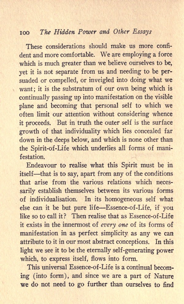 These considerations should make us more confident and more comfortable. We are employing a force which is much greater than we believe ourselves to be, yet it is not separate from us and needing to be persuaded or compelled, or inveigled into doing what we want; it is the substratum of our own being which is continually passing up into manifestation on the visible plane and becoming that personal self to which we often limit our attention without considering whence it proceeds. But in truth the outer self is the surface growth of that individuality which lies concealed far down in the deeps below, and which is none other than the Spirit-of-Life which underlies all forms of manifestation.
