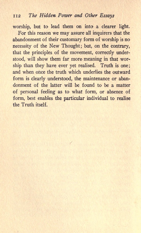 For this reason we may assure all inquirers that the abandonment of their customary form of worship is no necessity of the New Thought; but, on the contrary, that the principles of the movement, correctly understood, will show them far more meaning in that worship than they have ever yet realised. Truth is one; and when once the truth which underlies the outward form is clearly understood, the maintenance or abandonment of the latter will be found to be a matter of personal feeling as to what form, or absence of form, best enables the particular individual to realise the Truth itself.