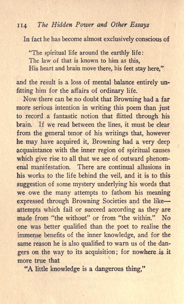 Now there can be no doubt that Browning had a far more serious intention in writing this poem than just to record a fantastic notion that flitted through his brain. If we read between the lines, it must be clear from the general tenor of his writings that, however he may have acquired it, Browning had a very deep acquaintance with the inner region of spiritual causes which give rise to all that we see of outward phenomenal manifestation. There are continual allusions in his works to the life behind the veil, and it is to this suggestion of some mystery underlying his words that we owe the many attempts to fathom his meaning expressed through Browning Societies and the like--attempts which fail or succeed according as they are made from "the without" or from "the within." No one was better qualified than the poet to realise the immense benefits of the inner knowledge, and for the same reason he is also qualified to warn us of the dangers on the way to its acquisition; for nowhere is it more true that