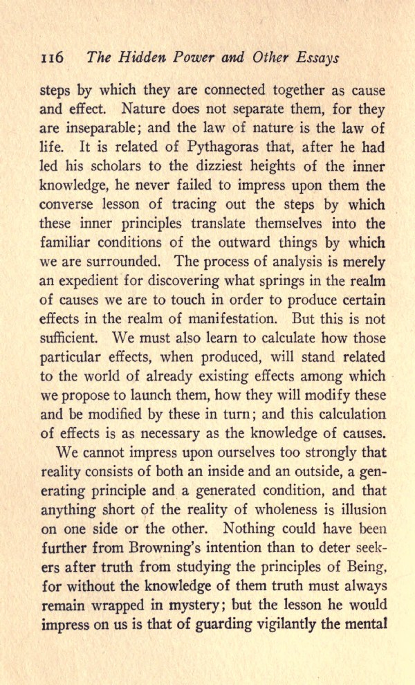 steps by which they are connected together as cause and effect. Nature does not separate them, for they are inseparable; and the law of nature is the law of life. It is related of Pythagoras that, after he had led his scholars to the dizziest heights of the inner knowledge, he never failed to impress upon them the converse lesson of tracing out the steps by which these inner principles translate themselves into the familiar conditions of the outward things by which we are surrounded. The process of analysis is merely an expedient for discovering what springs in the realm of causes we are to touch in order to produce certain effects in the realm of manifestation. But this is not sufficient. We must also learn to calculate how those particular effects, when produced, will stand related to the world of already existing effects among which we propose to launch them, how they will modify these and be modified by these in turn; and this calculation of effects is as necessary as the knowledge of causes.
