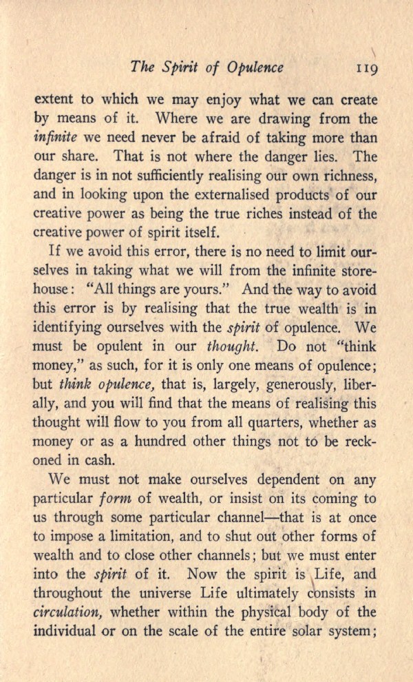 If we avoid this error, there is no need to limit ourselves in taking what we will from the infinite storehouse: "All things are yours." And the way to avoid this error is by realising that the true wealth is in identifying ourselves with the spirit of opulence. We must be opulent in our thought. Do not "think money," as such, for it is only one means of opulence; but think opulence, that is, largely, generously, liberally, and you will find that the means of realising this thought will flow to you from all quarters, whether as money or as a hundred other things not to be reckoned in cash.