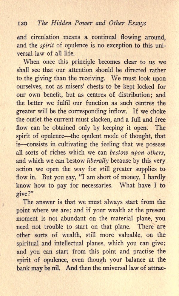 The answer is that we must always start from the point where we are; and if your wealth at the present moment is not abundant on the material plane, you need not trouble to start on that plane. There are other sorts of wealth, still more valuable, on the spiritual and intellectual planes, which you can give; and you can start from this point and practise the spirit of opulence, even though your balance at the bank may be nil. And then the universal law of attraction
