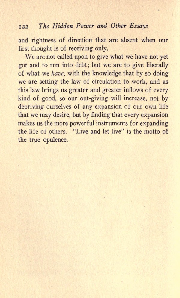 We are not called upon to give what we have not yet got and to run into debt; but we are to give liberally of what we have, with the knowledge that by so doing we are setting the law of circulation to work, and as this law brings us greater and greater inflows of every kind of good, so our out-giving will increase, not by depriving ourselves of any expansion of our own life that we may desire, but by finding that every expansion makes us the more powerful instruments for expanding the life of others. "Live and let live" is the motto of the true opulence.