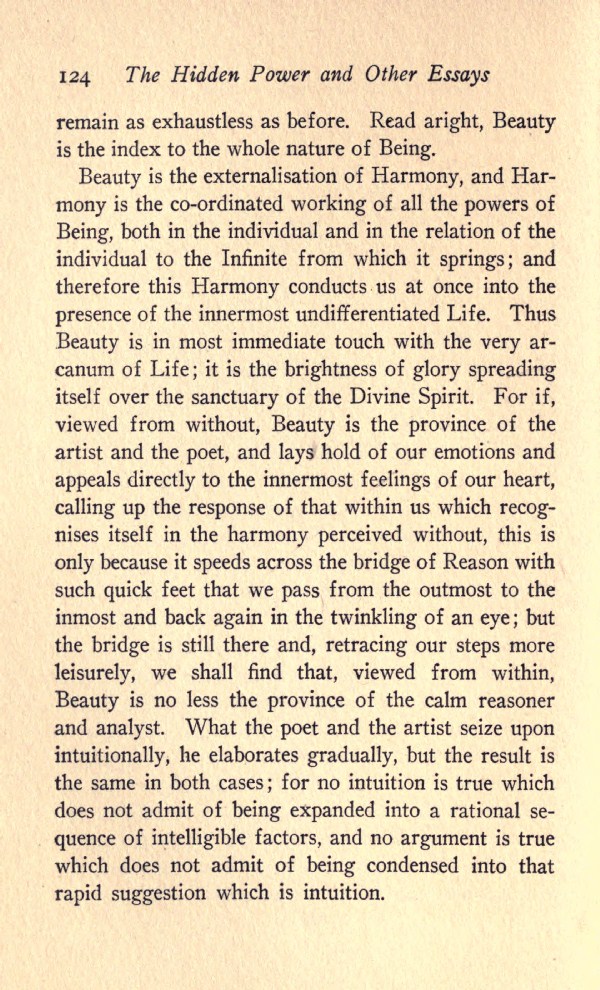 Beauty is the externalisation of Harmony, and Harmony is the co-ordinated working of all the powers of Being, both in the individual and in the relation of the individual to the Infinite from which it springs; and therefore this Harmony conducts us at once into the presence of the innermost undifferentiated Life. Thus Beauty is in most immediate touch with the very arcanum of Life; it is the brightness of glory spreading itself over the sanctuary of the Divine Spirit. For if, viewed from without, Beauty is the province of the artist and the poet, and lays hold of our emotions and appeals directly to the innermost feelings of our heart, calling up the response of that within us which recognises itself in the harmony perceived without, this is only because it speeds across the bridge of Reason with such quick feet that we pass from the outmost to the inmost and back again in the twinkling of an eye; but the bridge is still there and, retracing our steps more leisurely, we shall find that, viewed from within, Beauty is no less the province of the calm reasoner and analyst. What the poet and the artist seize upon intuitionally, he elaborates gradually, but the result is the same in both cases; for no intuition is true which does not admit of being expanded into a rational sequence of intelligible factors, and no argument is true which does not admit of being condensed into that rapid suggestion which is intuition.