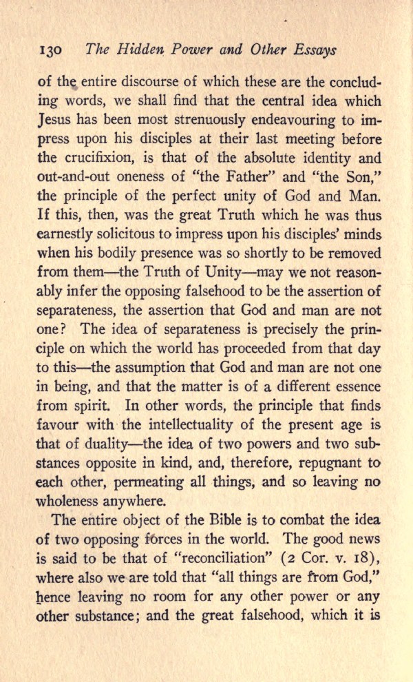 of the entire discourse of which these are the concluding words, we shall find that the central idea which Jesus has been most strenuously endeavouring to impress upon his disciples at their last meeting before the crucifixion, is that of the absolute identity and out-and-out oneness of "the Father" and "the Son," the principle of the perfect unity of God and Man. If this, then, was the great Truth which he was thus earnestly solicitous to impress upon his disciples' minds when his bodily presence was so shortly to be removed from them--the Truth of Unity--may we not reasonably infer the opposing falsehood to be the assertion of separateness, the assertion that God and man are not one? The idea of separateness is precisely the principle on which the world has proceeded from that day to this--the assumption that God and man are not one in being, and that the matter is of a different essence from spirit. In other words, the principle that finds favour with the intellectuality of the present age is that of duality--the idea of two powers and two substances opposite in kind, and, therefore, repugnant to each other, permeating all things, and so leaving no wholeness anywhere.