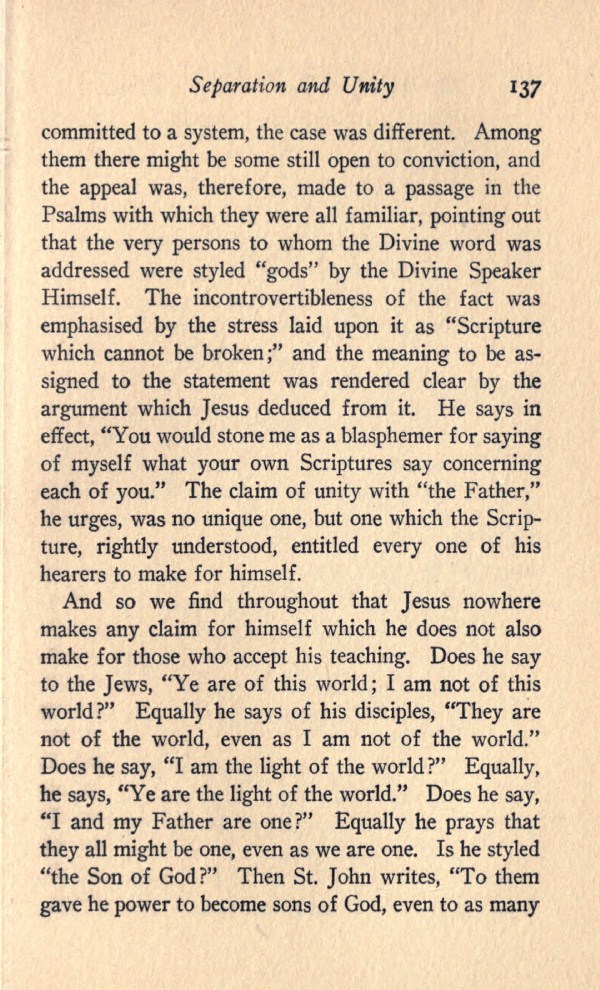 And so we find throughout that Jesus nowhere makes any claim for himself which he does not also make for those who accept his teaching. Does he say to the Jews, "Ye are of this world; I am not of this world?" Equally he says of his disciples, "They are not of the world, even as I am not of the world." Does he say, "I am the light of the world?" Equally, he says, "Ye are the light of the world." Does he say, "I and my Father are one?" Equally he prays that they all might be one, even as we are one. Is he styled "the Son of God?" Then St. John writes, "To them gave he power to become sons of God, even to as many