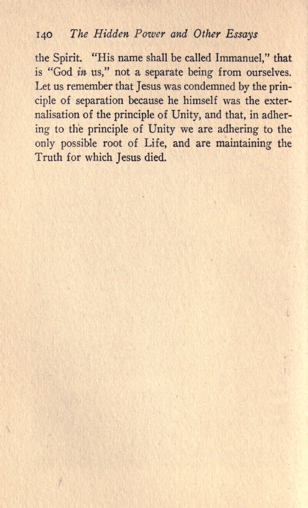 the Spirit. "His name shall be called Immanuel," that is "God in us," not a separate being from ourselves. Let us remember that Jesus was condemned by the principle of separation because he himself was the externalisation of the principle of Unity, and that, in adhering to the principle of Unity we are adhering to the only possible root of Life, and are maintaining the Truth for which Jesus died.