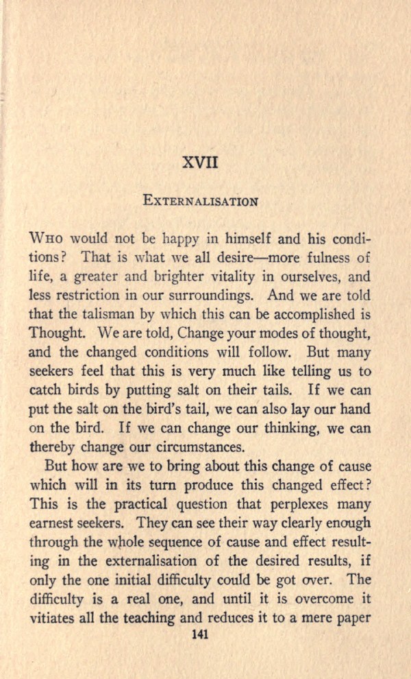 Who would not be happy in himself and his conditions? That is what we all desire--more fulness of life, a greater and brighter vitality in ourselves, and less restriction in our surroundings. And we are told that the talisman by which this can be accomplished is Thought. We are told, Change your modes of thought, and the changed conditions will follow. But many seekers feel that this is very much like telling us to catch birds by putting salt on their tails. If we can put the salt on the bird's tail, we can also lay our hand on the bird. If we can change our thinking, we can thereby change our circumstances.