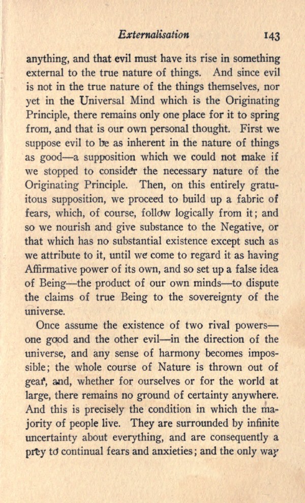 Once assume the existence of two rival powers--one good and the other evil--in the direction of the universe, and any sense of harmony becomes impossible; the whole course of Nature is thrown out of gear, and, whether for ourselves or for the world at large, there remains no ground of certainty anywhere. And this is precisely the condition in which the majority of people live. They are surrounded by infinite uncertainty about everything, and are consequently a prey to continual fears and anxieties; and the only way