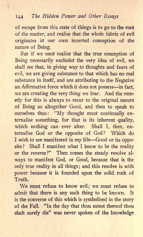 But if we once realise that the true conception of Being necessarily excludes the very idea of evil, we shall see that, in giving way to thoughts and fears of evil, we are giving substance to that which has no real substance in itself, and are attributing to the Negative an Affirmative force which it does not possess--in fact, we are creating the very thing we fear. And the remedy for this is always to recur to the original nature of Being as altogether Good, and then to speak to ourselves thus: "My thought must continually externalise something, for that is its inherent quality, which nothing can ever alter. Shall I, then, externalise God or the opposite of God? Which do I wish to see manifested in my life--Good or its opposite? Shall I manifest what I know to be the reality or the reverse?" Then comes the steady resolve always to manifest God, or Good, because that is the only true reality in all things; and this resolve is with power because it is founded upon the solid rock of Truth.