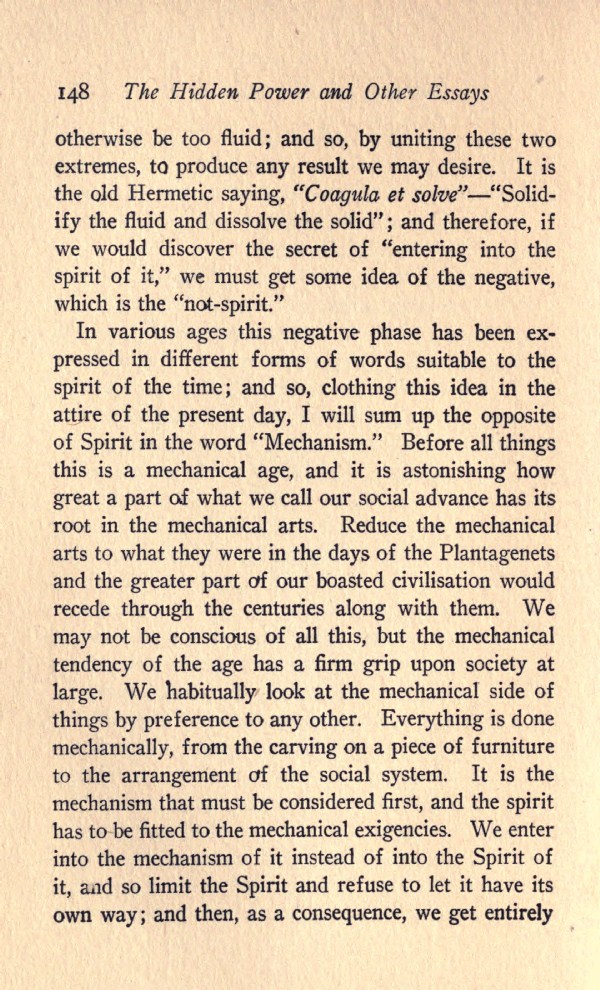 In various ages this negative phase has been expressed in different forms of words suitable to the spirit of the time; and so, clothing this idea in the attire of the present day, I will sum up the opposite of Spirit in the word "Mechanism." Before all things this is a mechanical age, and it is astonishing how great a part of what we call our social advance has its root in the mechanical arts. Reduce the mechanical arts to what they were in the days of the Plantagenets and the greater part of our boasted civilisation would recede through the centuries along with them. We may not be conscious of all this, but the mechanical tendency of the age has a firm grip upon society at large. We habitually look at the mechanical side of things by preference to any other. Everything is done mechanically, from the carving on a piece of furniture to the arrangement of the social system. It is the mechanism that must be considered first, and the spirit has to be fitted to the mechanical exigencies. We enter into the mechanism of it instead of into the Spirit of it, and so limit the Spirit and refuse to let it have its own way; and then, as a consequence, we get entirely