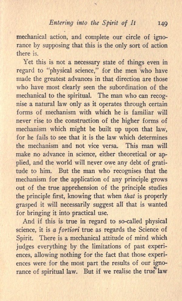 And if this is true in regard to so-called physical science, it is a fortiori true as regards the Science of Spirit. There is a mechanical attitude of mind which judges everything by the limitations of past experiences, allowing nothing for the fact that those experiences were for the most part the, results of our ignorance of spiritual law. But if we realise the true law