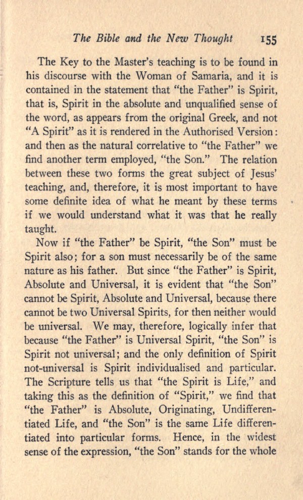 The Key to the Master's teaching is to be found in his discourse with the Woman of Samaria, and it is contained in the statement that "the Father" is Spirit, that is, Spirit in the absolute and unqualified sense of the word, as appears from the original Greek, and not "A Spirit" as it is rendered in the Authorised Version: and then as the natural correlative to "the Father" we find another term employed, "the Son." The relation between these two forms the great subject of Jesus' teaching, and, therefore, it is most important to have some definite idea of what he meant by these terms if we would understand what it was that he really taught.