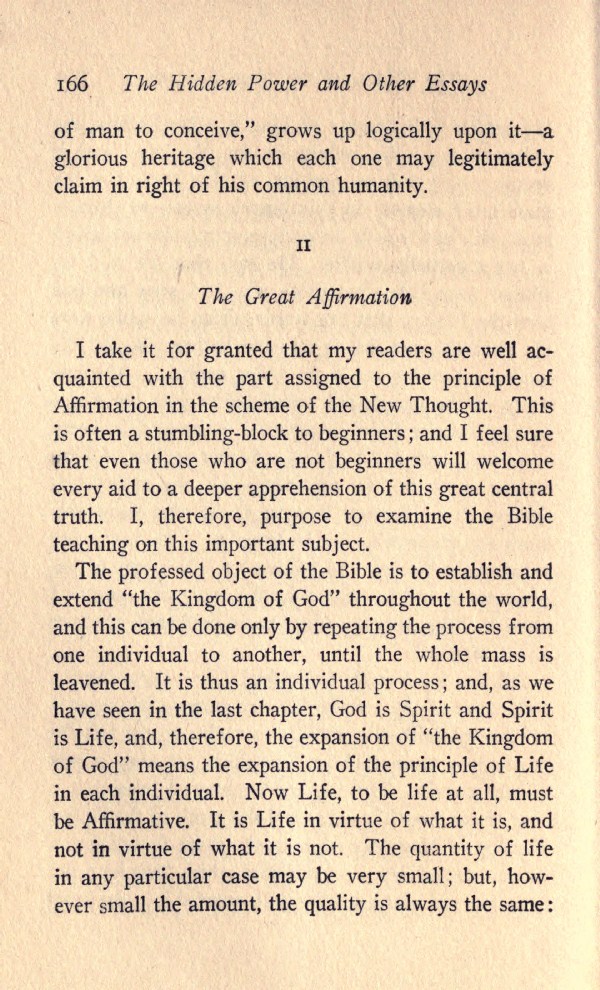 Contents - The Hidden Power - Perversion of Truth - The "I Am" - Affirmative Power - Submission - Completeness - Principle of Guidance - Desire As The Motive Power - Touching Lightly - Present Truth - Yourself - Religious Opinions - Lesson From Browning - Spirit of Opulence - Beauty - Separation And Unity - Externalisation - Entering Into The Spirit Of It - The Bible And The New Thought - Son - Great Affirmation - Father - Conclusion - Jachin And Boaz - Hephzibah - Mind And Hand - Central Control - What Is Higher Thought - Fragments