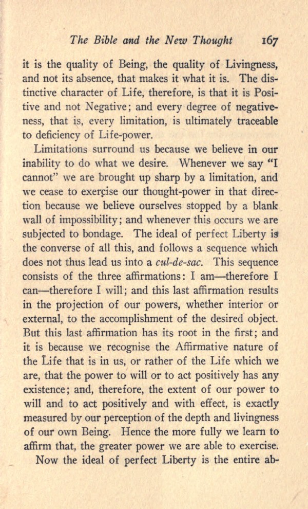 Limitations surround us because we believe in our inability to do what we desire. Whenever we say "I cannot" we are brought up sharp by a limitation, and we cease to exercise our thought-power in that direction because we believe ourselves stopped by a blank wall of impossibility; and whenever this occurs we are subjected to bondage. The ideal of perfect Liberty is the converse of all this, and follows a sequence which does not thus lead us into a cul-de-sac. This sequence consists of the three affirmations: I am--therefore I can--therefore I will; and this last affirmation results in the projection of our powers, whether interior or external, to the accomplishment of the desired object. But this last affirmation has its root in the first; and it is because we recognise the Affirmative nature of the Life that is in us, or rather of the Life which we are, that the power to will or to act positively has any existence; and, therefore, the extent of our power to will and to act positively and with effect, is exactly measured by our perception of the depth and livingness of our own Being. Hence the more fully we learn to affirm that, the greater power we are able to exercise.