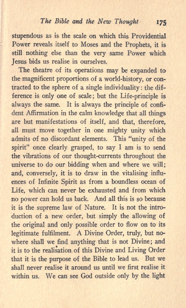 The theatre of its operations may be expanded to the magnificent proportions of a world-history, or contracted to the sphere of a single individuality: the difference is only one of scale; but the Life-principle is always the same. It is always the principle of confident Affirmation in the calm knowledge that all things are but manifestations of itself, and that, therefore, all must move together in one mighty unity which admits of no discordant elements. This "unity of the spirit" once clearly grasped, to say I am is to send the vibrations of our thought-currents throughout the universe to do our bidding when and where we will; and, conversely, it is to draw in the vitalising influences of Infinite Spirit as from a boundless ocean of Life, which can never be exhausted and from which no power can hold us back. And all this is so because it is the supreme law of Nature. It is not the introduction of a new order, but simply the allowing of the original and only possible order to flow on to its legitimate fulfilment. A Divine Order, truly, but nowhere shall we find anything that is not Divine; and it is to the realisation of this Divine and Living Order that it is the purpose of the Bible to lead us. But we shall never realise it around us until we first realise it within us. We can see God outside only by the light