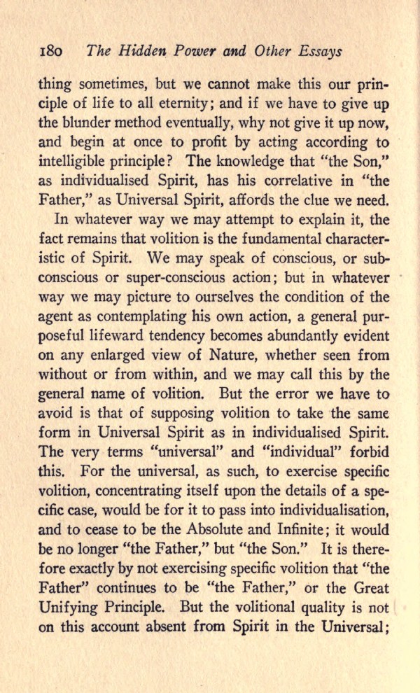 In whatever way we may attempt to explain it, the fact remains that volition is the fundamental characteristic of Spirit. We may speak of conscious, or sub-conscious or super-conscious action; but in whatever way we may picture to ourselves the condition of the agent as contemplating his own action, a general purposeful lifeward tendency becomes abundantly evident on any enlarged view of Nature, whether seen from without or from within, and we may call this by the general name of volition. But the error we have to avoid is that of supposing volition to take the same form in Universal Spirit as in individualised Spirit. The very terms "universal" and "individual" forbid this. For the universal, as such, to exercise specific volition, concentrating itself upon the details of a specific case, would be for it to pass into individualisation, and to cease to be the Absolute and Infinite; it would be no longer "the Father," but "the Son." It is therefore exactly by not exercising specific volition that "the Father" continues to be "the Father," or the Great Unifying Principle. But the volitional quality is not on this account absent from Spirit in the Universal;