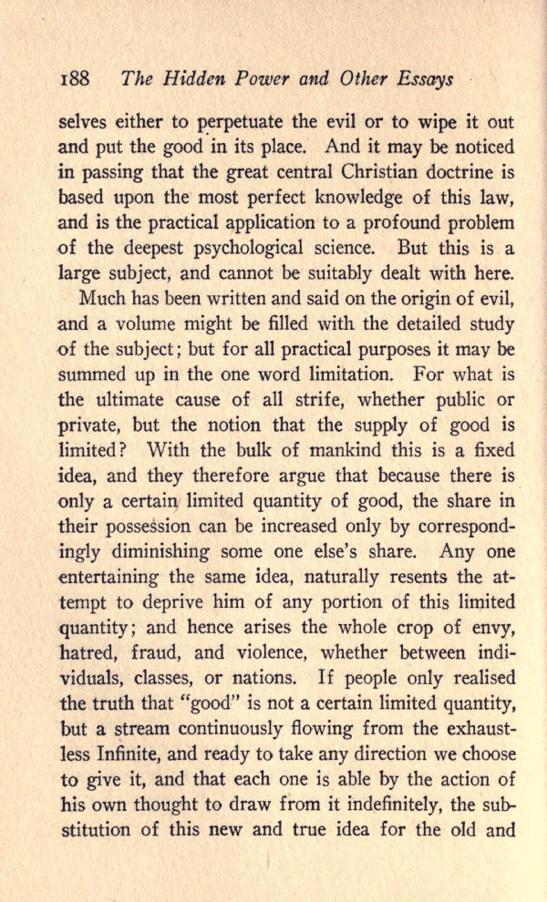 Much has been written and said on the origin of evil, and a volume might be filled with the detailed study of the subject; but for all practical purposes it may be summed up in the one word limitation. For what is the ultimate cause of all strife, whether public or private, but the notion that the supply of good is limited? With the bulk of mankind this is a fixed idea, and they therefore argue that because there is only a certain limited quantity of good, the share in their possession can be increased only by correspondingly diminishing some one else's share. Any one entertaining the same idea, naturally resents the attempt to deprive him of any portion of this limited quantity; and hence arises the whole crop of envy, hatred, fraud, and violence, whether between individuals, classes, or nations. If people only realised the truth that "good" is not a certain limited quantity, but a stream continuously flowing from the exhaustless Infinite, and ready to take any direction we choose to give it, and that each one is able by the action of his own thought to draw from it indefinitely, the substitution of this new and true idea for the old and