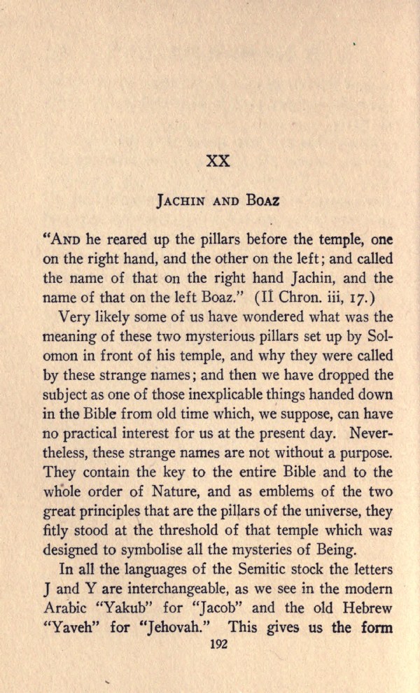 Very likely some of us have wondered what was the meaning of these two mysterious pillars set up by Solomon in front of his temple, and why they were called by these strange names; and then we have dropped the subject as one of those inexplicable things handed down in the Bible from old time which, we suppose, can have no practical interest for us at the present day. Nevertheless, these strange names are not without a purpose. They contain the key to the entire Bible and to the whole order of Nature, and as emblems of the two great principles that are the pillars of the universe, they fitly stood at the threshold of that temple which was designed to symbolise all the mysteries of Being.