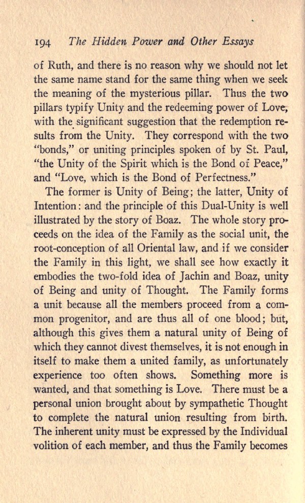 The former is Unity of Being; the latter, Unity of Intention: and the principle of this Dual-Unity is well illustrated by the story of Boaz. The whole story proceeds on the idea of the Family as the social unit, the root-conception of all Oriental law, and if we consider the Family in this light, we shall see how exactly it embodies the two-fold idea of Jachin and Boaz, unity of Being and unity of Thought. The Family forms a unit because all the members proceed from a common progenitor, and are thus all of one blood; but, although this gives them a natural unity of Being of which they cannot divest themselves, it is not enough in itself to make them a united family, as unfortunately experience too often shows. Something more is wanted, and that something is Love. There must be a personal union brought about by sympathetic Thought to complete the natural union resulting from birth. The inherent unity must be expressed by the Individual volition of each member, and thus the Family becomes