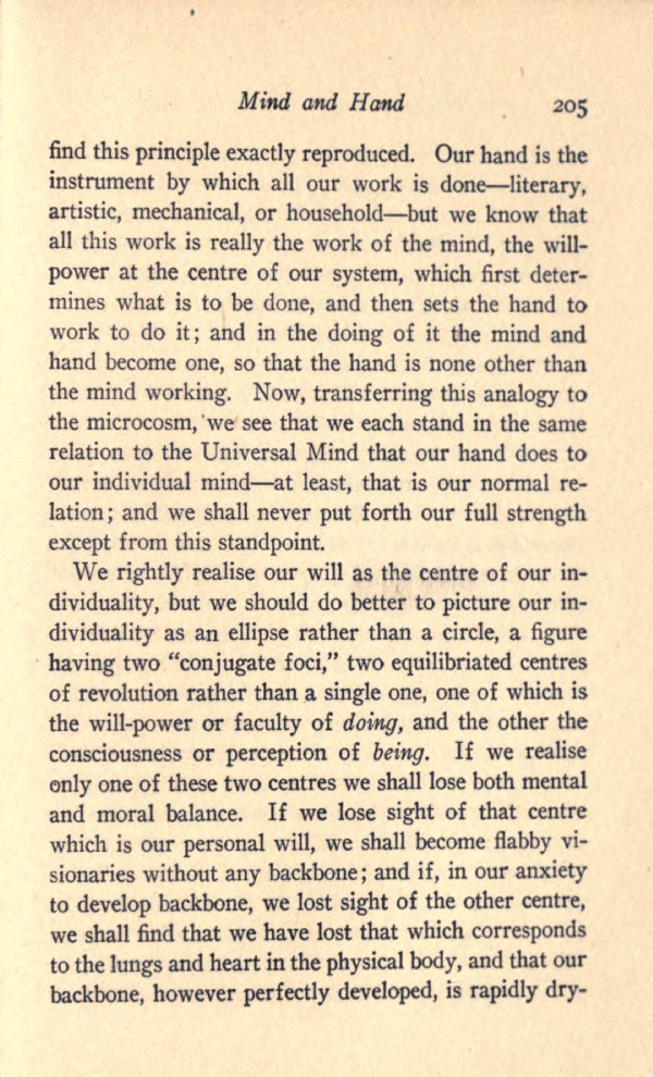 We rightly realise our will as the centre of our individuality, but we should do better to picture our individuality as an ellipse rather than a circle, a figure having two "conjugate foci," two equilibriated centres of revolution rather than a single one, one of which is the will-power or faculty of doing, and the other the consciousness or perception of being. If we realise only one of these two centres we shall lose both mental and moral balance. If we lose sight of that centre which is our personal will, we shall become flabby visionaries without any backbone; and if, in our anxiety to develop backbone, we lost sight of the other centre, we shall find that we have lost that which corresponds to the lungs and heart in the physical body, and that our backbone, however perfectly developed, is rapidly drying
