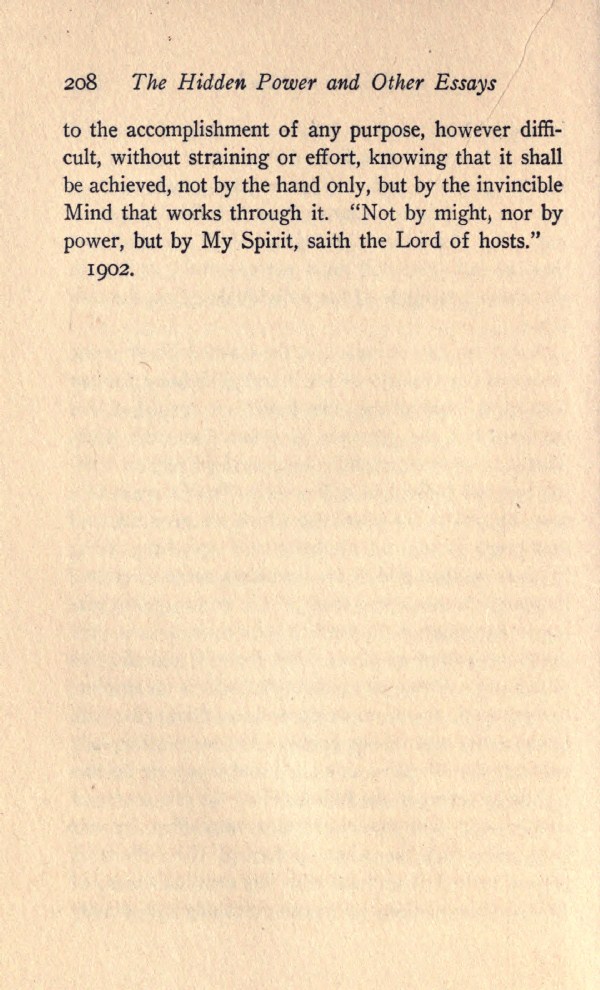 to the accomplishment of any purpose, however difficult, without straining or effort, knowing that it shall be achieved, not by the hand only, but by the invincible Mind that works through it. "Not by might, nor by power, but by My Spirit, saith the Lord of hosts."