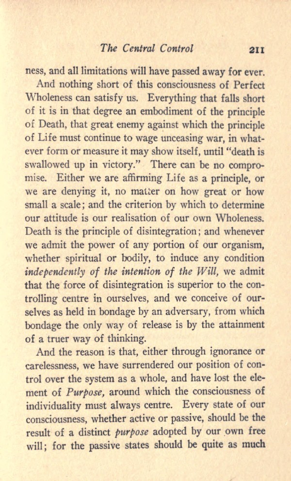 And nothing short of this consciousness of Perfect Wholeness can satisfy us. Everything that falls short of it is in that degree an embodiment of the principle of Death, that great enemy against which the principle of Life must continue to wage unceasing war, in whatever form or measure it may show itself, until "death is swallowed up in victory." There can be no compromise. Either we are affirming Life as a principle, or we are denying it, no matter on how great or how small a scale; and the criterion by which to determine our attitude is our realisation of our own Wholeness. Death is the principle of disintegration; and whenever we admit the power of any portion of our organism, whether spiritual or bodily, to induce any condition independently of the intention of the Will, we admit that the force of disintegration is superior to the controlling centre in ourselves, and we conceive of ourselves as held in bondage by an adversary, from which bondage the only way of release is by the attainment of a truer way of thinking.