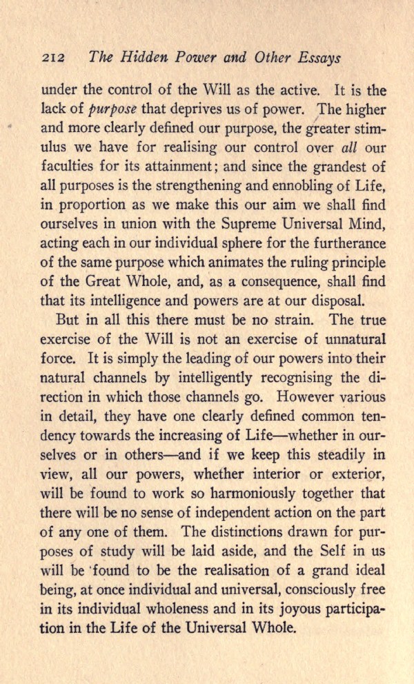under the control of the Will as the active. It is the lack of purpose that deprives us of power. The higher and more clearly defined our purpose, the greater stimulus we have for realising our control over all our faculties for its attainment; and since the grandest of all purposes is the strengthening and ennobling of Life, in proportion as we make this our aim we shall find ourselves in union with the Supreme Universal Mind, acting each in our individual sphere for the furtherance of the same purpose which animates the ruling principle of the Great Whole, and, as a consequence, shall find that its intelligence and powers are at our disposal.