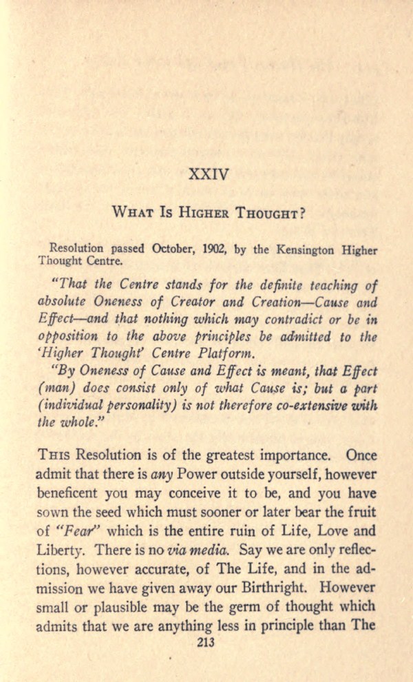 "That the Centre stands for the definite teaching of absolute Oneness of Creator and Creation--Cause and Effect--and that nothing which may contradict or be in opposition to the above principles be admitted to the 'Higher Thought' Centre Platform.