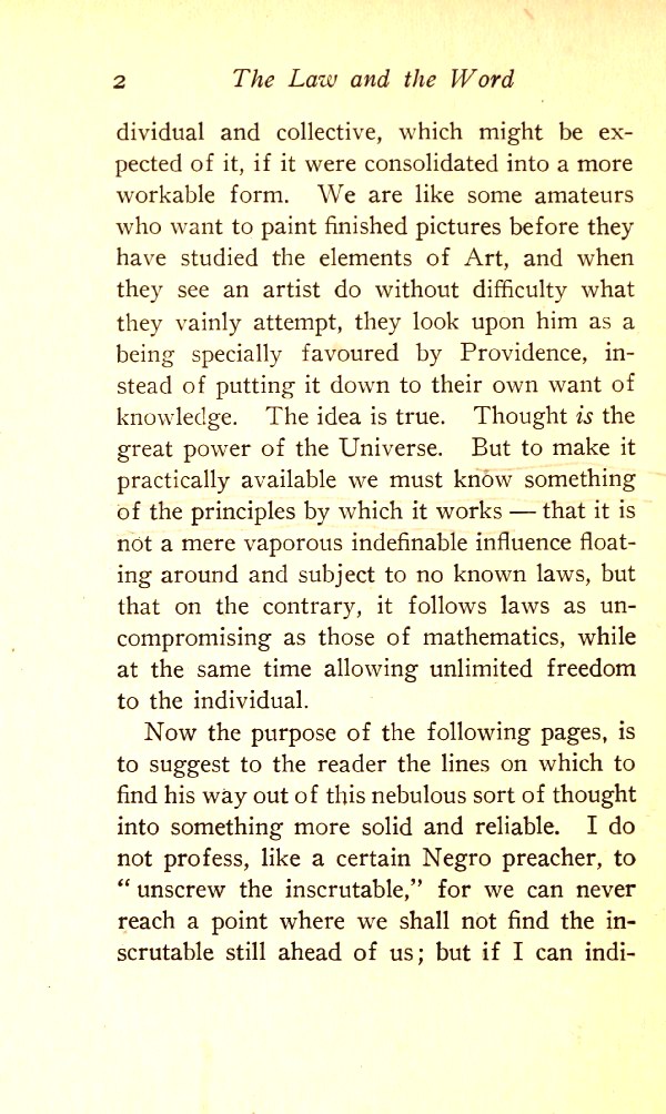 and collective, which might be expected of it, if it were consolidated into a more workable form. We are like some amateurs who want to paint finished pictures before they have studied the elements of Art, and when they see an artist do without difficulty what they vainly attempt, they look upon him as being specially favoured by Providence, instead of putting it down to their own want of knowledge. The idea is true. Thought is the great power of the Universe. But to make it practically available we must know something of the principles by which it works --- that it is not a mere vaporous indefinable influence floating around and subject to no known laws, but that on the contrary, it follows laws as uncompromising as those of mathematics, while at the same time allowing unlimited freedom to the individual.