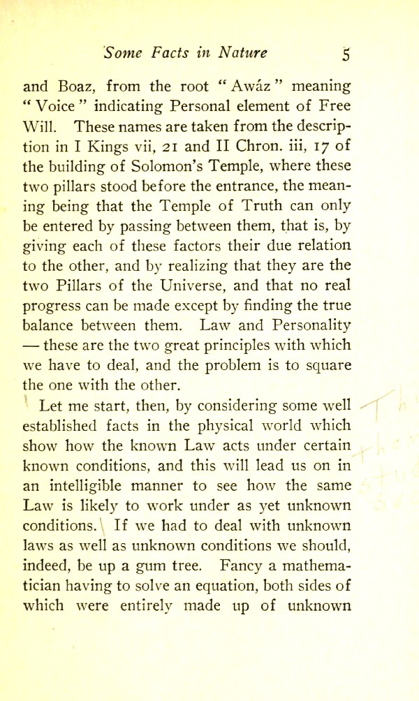 Let me start, then, by considering some well-established facts in the physical world which show how the known Law acts under certain known conditions, and this will lead us on in an intelligible manner to see how the same Law is likely to work under as yet unknown conditions. If we had to deal with unknown laws as well as unknown conditions we should, indeed, be up a gum tree. Fancy a mathematician having to solve an equation, both sides of which were entirely made up of unknown