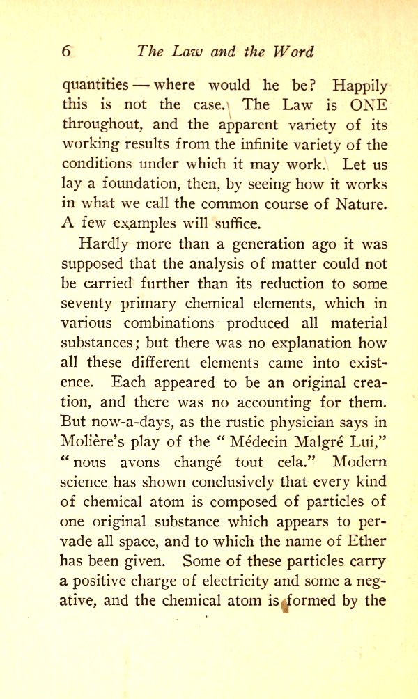 Modern science has shown conclusively that every kind of chemical atom is composed of particles of one original substance which appears to pervade all space, and to which the name of Ether has been given.