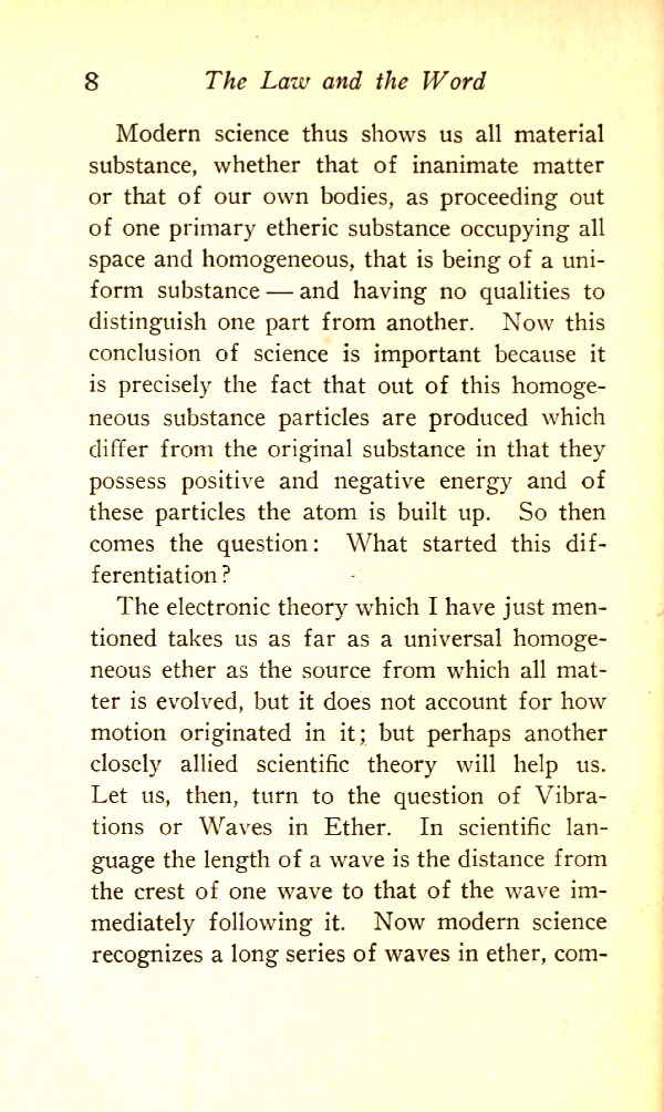 Modern science thus shows us all material substance, whether that of inanimate matter or that of our own bodies, as proceeding out of one primary etheric substance occupying all space and homogeneous --- that is, being of a uniform substance --- and having no qualities to distinguish one part from another. Now this conclusion of science is important because it is precisely the fact that out of this homogeneous substance particles are produced which differ from the original substance in that they possess positive and negative energy, and of these particles the atom is built up. So then comes the question: What started the differentiation?