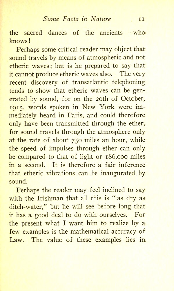 Perhaps some critical reader may object that sound travels by means of atmospheric and not etheric waves; but is he prepared to say that it cannot produce etheric waves also? The very recent discovery of transatlantic telephoning tends to show that etheric waves can be generated by sound, for on the 20th of October, 1915, words spoken in New York were immediately heard in Paris and could therefore only have been transmitted through the ether, for sound travels through the atmosphere only at the rate of about 750 miles an hour, while the speed of impulses through ether can only be compared with that of light, or 186,000 miles in a second. It is therefore a fair inference that etheric vibrations can be inaugurated by sound.