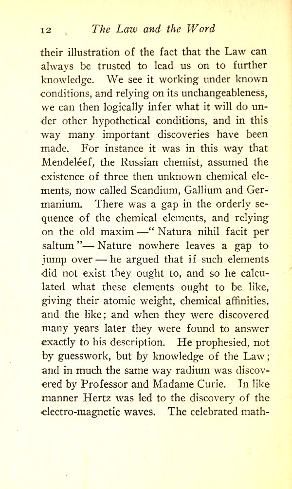 For instance it was in this way that Mendeleef, the Russian chemist, assumed the existence of three then unknown elements, now called Scandium, Gallium, and Germanium. There was a gap in the orderly sequence of the chemical elements and, relying on the old maxim Natura nihil facit per saltum --- "Nature nowhere leaves a gap to jump over" --- he argued that if such elements did not exist, they ought to, and so he calculated what these elements ought to be like, giving their atomic weight, chemical affinities, and the like; and when they were discovered many years later, they were found to answer exactly to his description. He prophesied, not by guesswork, but by knowledge of the Law; and in much the same way radium was discovered by Professor and Madame Curie In like manner Hertz was led to the discovery of the electromagnetic waves. The celebrated