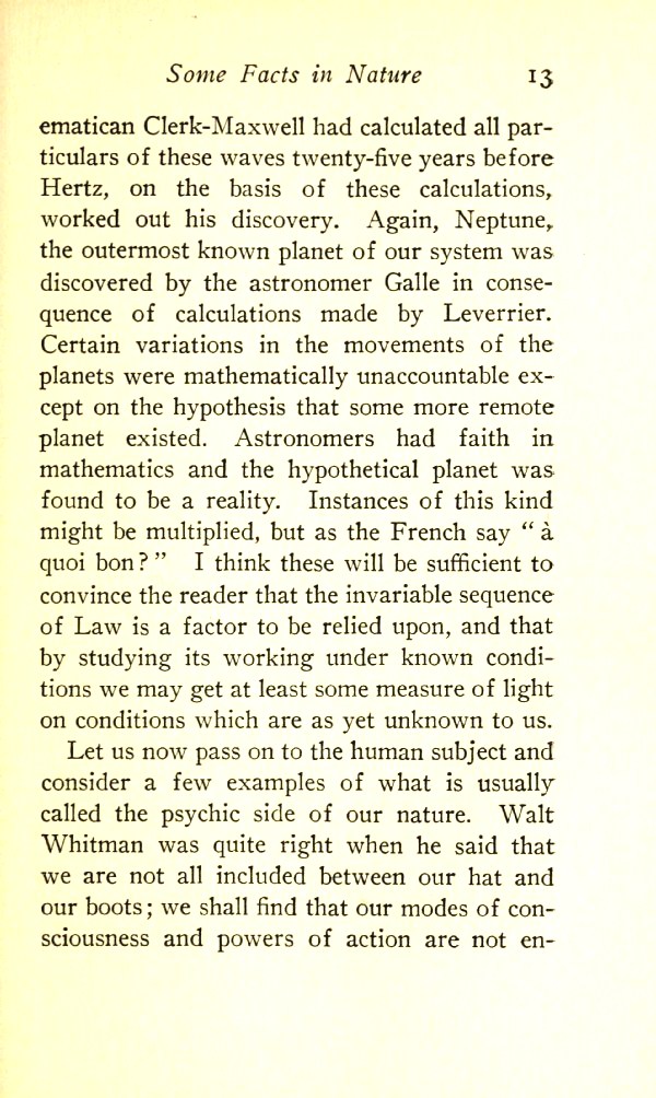 mathematician Clerk-Maxwell had calculated all particulars of these waves twenty-five years before Hertz, on the basis of these calculations, worked out his discovery. Again, Neptune, the outermost planet of our system, was discovered by the astronomer Galle in consequence of calculations made by Leverrier. Certain variations in the movements of the planets were mathematically unaccountable except on the hypothesis that some more remote planet existed. Astronomers had faith in mathematics, and the hypothetical planet was found to be a reality.