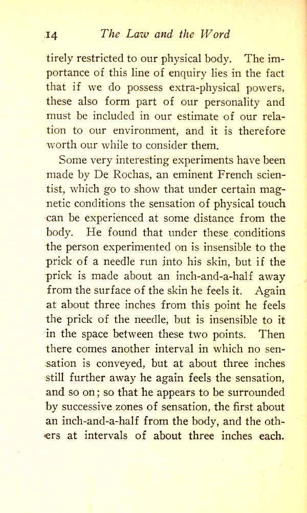 Some very interesting experiments have been made by De Rochas, an eminent French scientist, which go to show that under certain magnetic conditions the sensation of physical touch can be experienced at some distance from the body. He found that under these conditions the person experimented on is insensible to the prick of a needle run into his skin, but if the prick is made about an inch-and-a-half away from the surface of the skin, he feels it. Again, at about three inches from this point he feels the prick of the needle, but is insensitive to it in the space between these two points. Then there comes another interval in which no sensation is conveyed, but at about three inches still further away he again feels the sensation, and so on; so that he appears to be surrounded by successive zones of sensation, the first about an inch-and-a-half from the body, and the others at intervals of about three inches each.