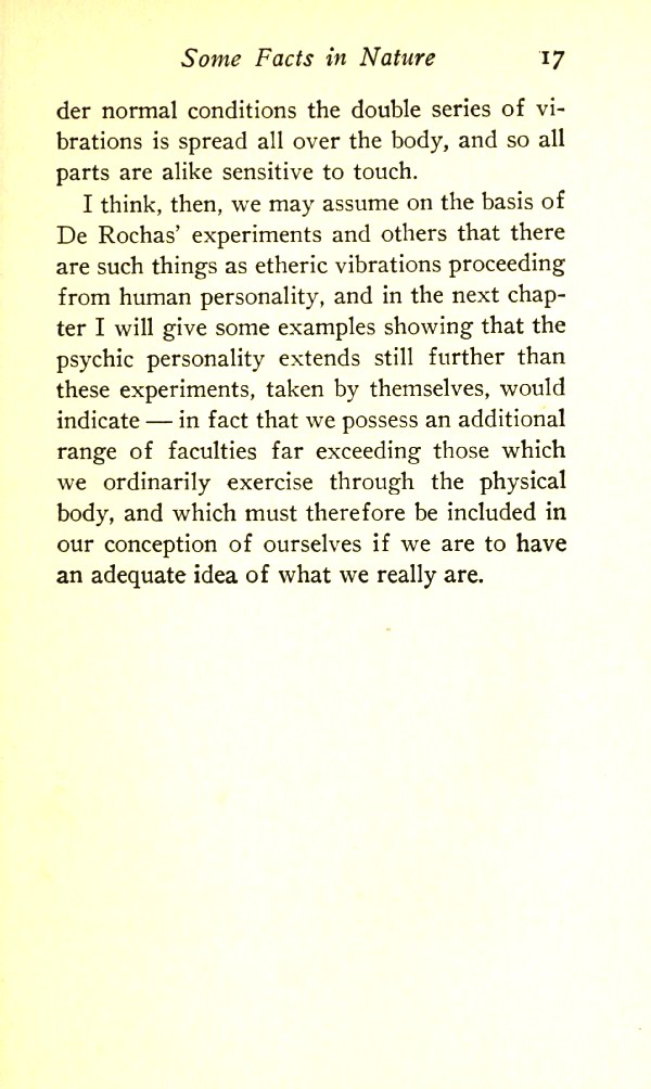 I think, then, we may assume on the basis of De Rochas' experiments and others that there are such things as etheric vibrations proceeding from human personality, and in the next chapter I will give some examples showing that psychic personality extends still further than these experiments, taken by themselves, would indicate --- in fact that we possess an additional range of faculties far exceeding those which we ordinarily exercise through the physical body, and which must therefore be included in our conception of ourselves if we are to have an adequate idea of what we really are.