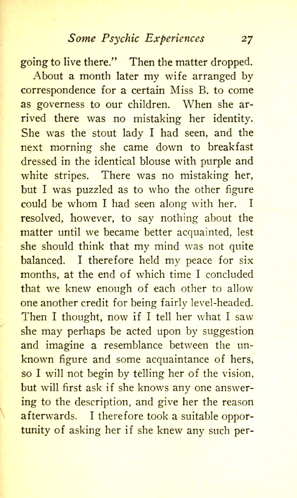 About a month later my wife arranged by correspondence for a certain lady to come as governess to our children. When she arrived, there was no mistaking her identity. She was the stout lady I had seen, and the next morning she came down to breakfast dressed in the identical blouse with purple and white stripes.