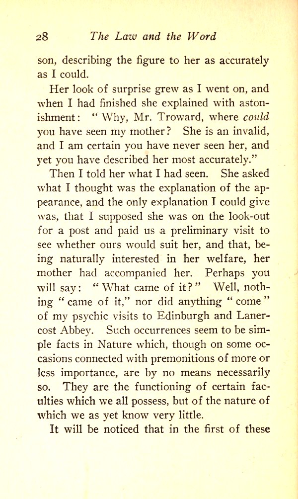 Her look of surprise grew as I went on, and when I had finished she explained with astonishment: "Why, Mr Troward, where could you have seen my mother? She is an invalid, and I am certain you have never seen her, and yet you have described her most accurately".